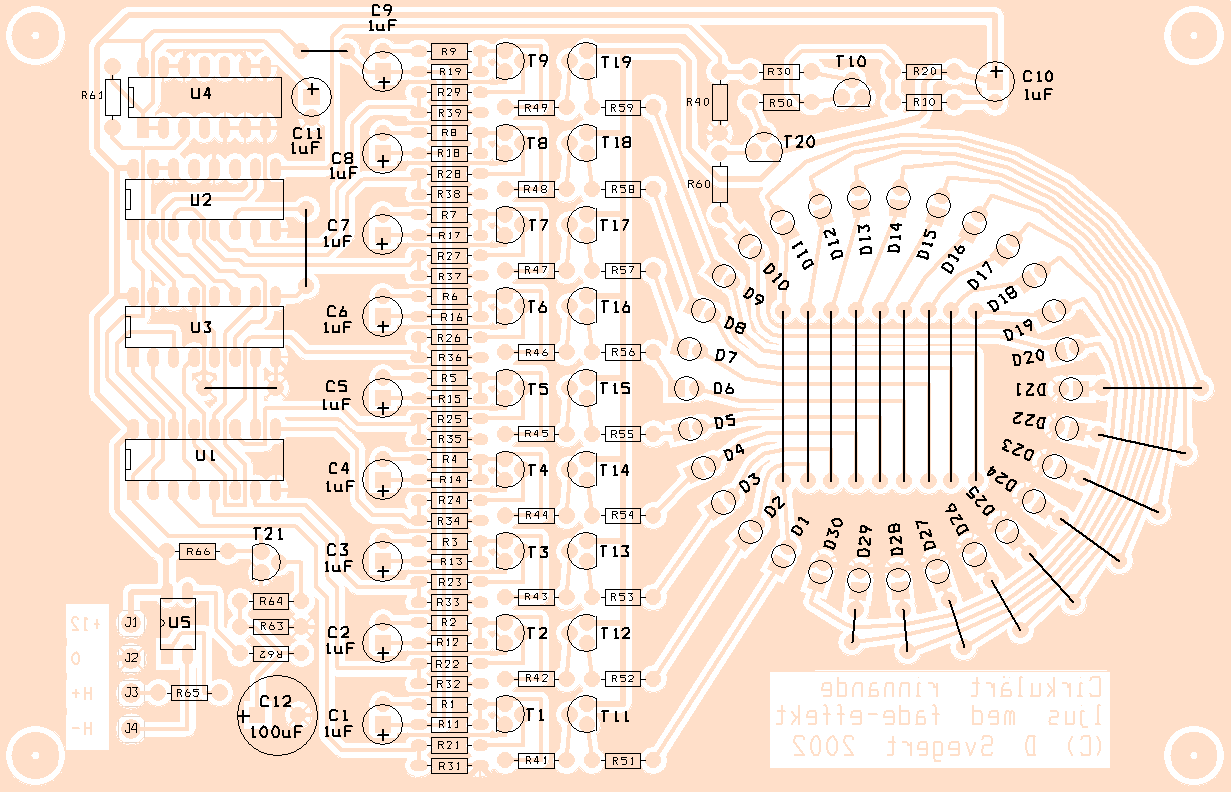 Tillverka kretskortet, borra alla hål, och löd dit alla prylar. Tänk på att montera lysdioderna åt rätt håll: det långa benet (plus) genom den fyrkantiga lödpunkten.